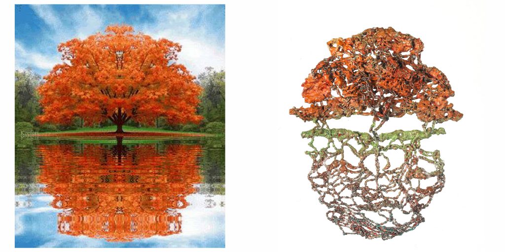 This latest collection is inspired by found images depicting flora and fauna. The images are chosen for their visual composition or specific aesthetic elements and are given a three dimensional ‘chained interpretation’, thus converting them into wearable pieces of jewellery. Unlike the making process used in preceding work, each enamel colour is fused and fired on the chain separately and the piece is constructed afterwards from the previously enamelled chain. This allows the piece to evolve with the various types of chain and colours mixing and intertwining, poetically responding to the images as if they were ‘still lives’ , translating them into an impressionistic pixelated relief of textured layers. L.P.